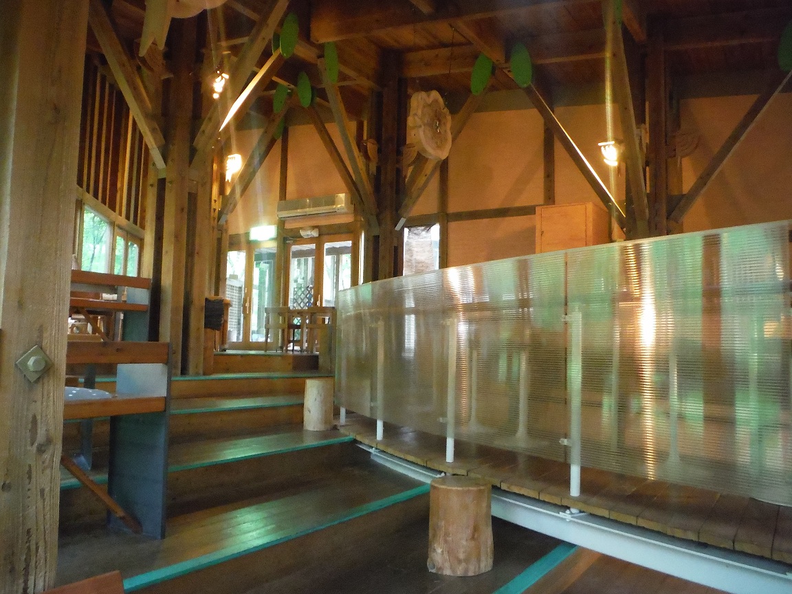 更に木をあしらった柱や時計、原木で作られたテーブルや椅子があたかも森の中にいる様な気にさせる。