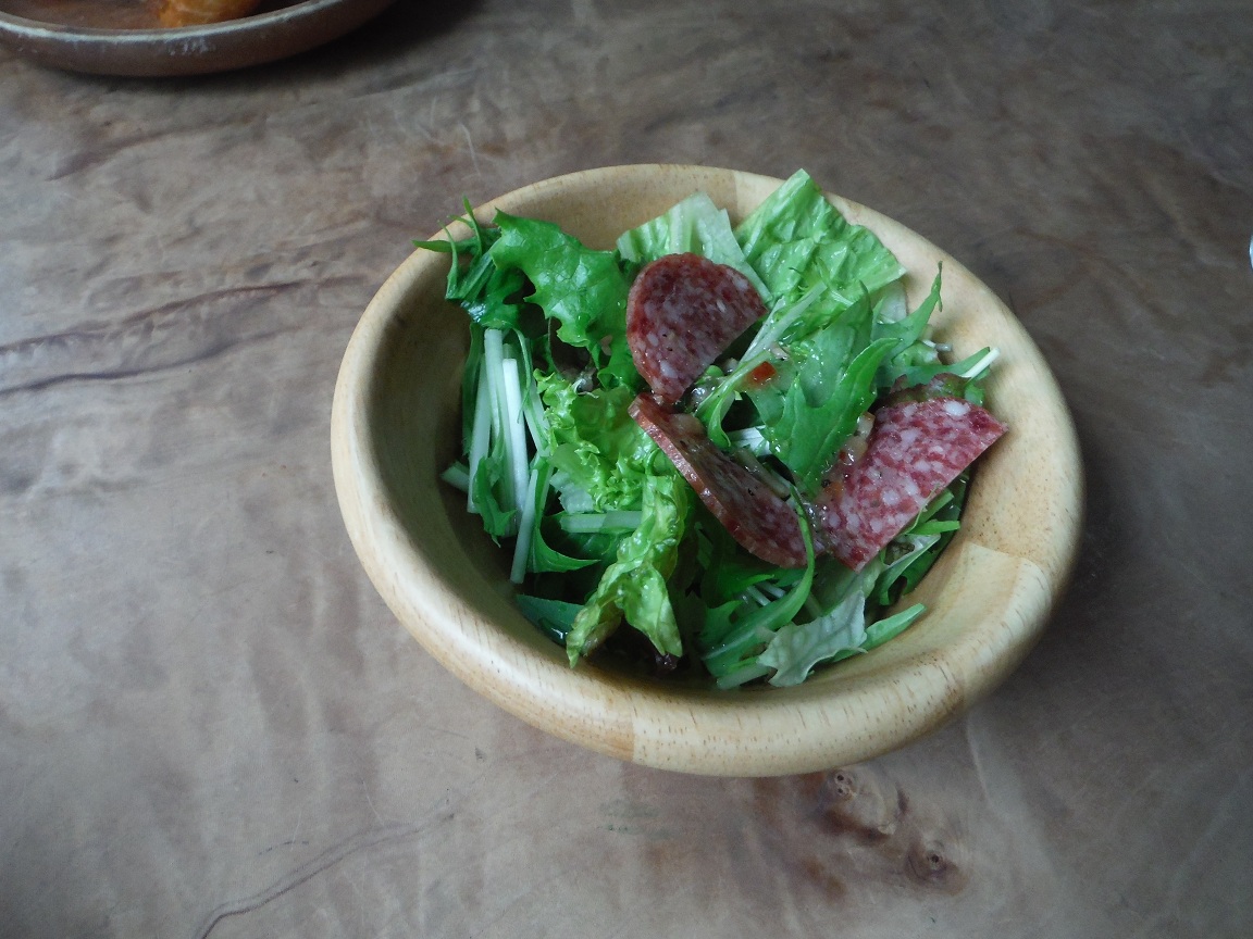 前菜のサラダは、サラミとシャキシャキの草が楽しい食感を醸し出してくれる(食べログチックに表現)