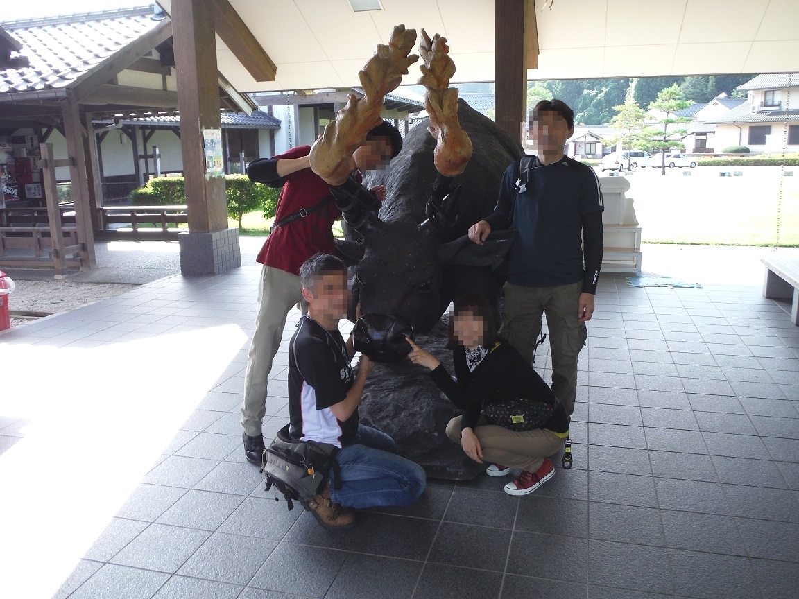 木曽義仲が平家を夜討ちした時の戦法「火牛の計」の模型の前で撮影。