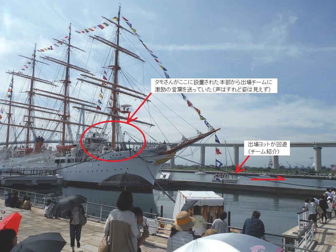 橋の上から海王丸と各チームのヨットの対比を楽しみつつレールの成功を祈っておいた。
