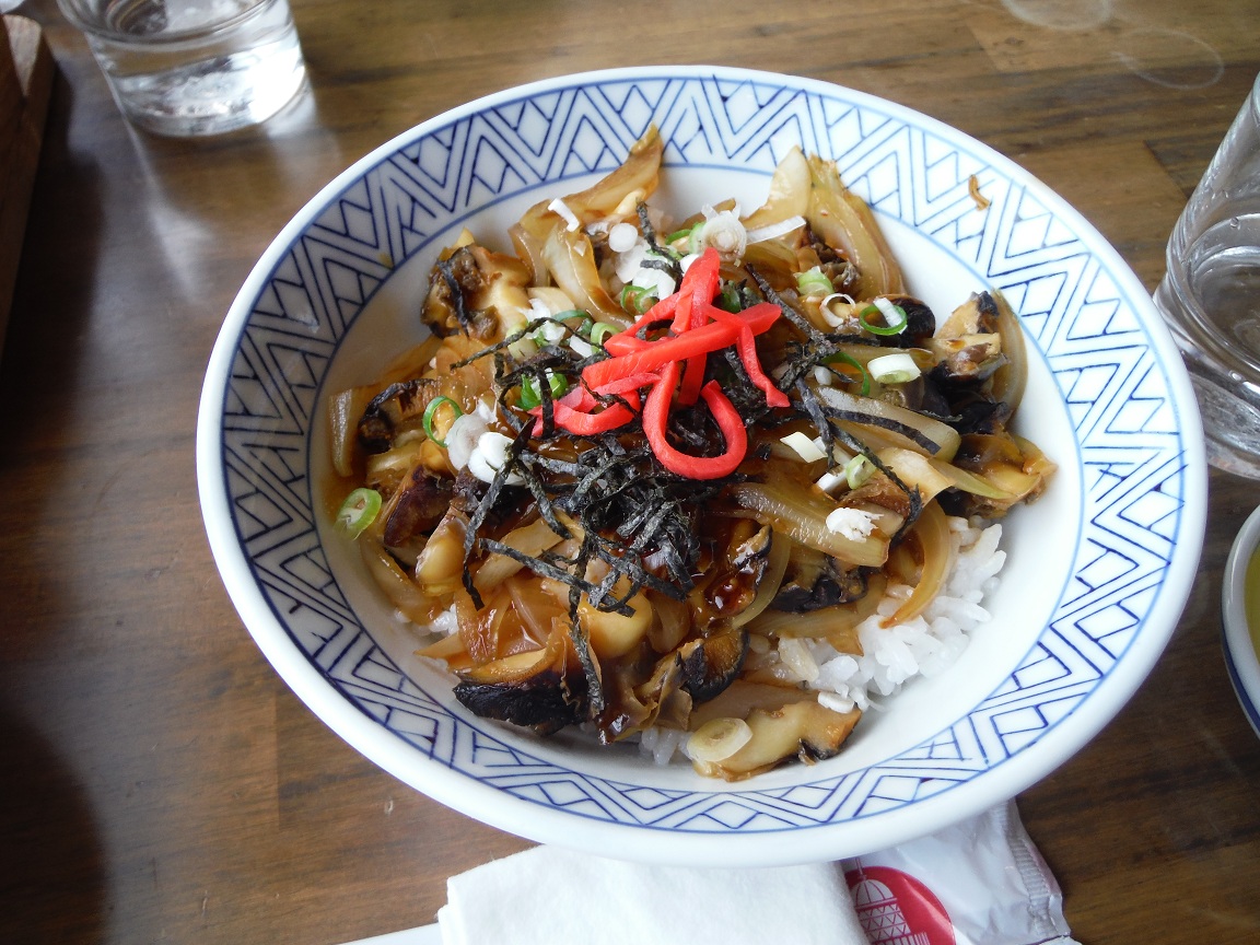 MDさんはカツ丼、KGくんは天丼、ワッチ&こげ黒さん&サッチャーは豆腐丼を食す。