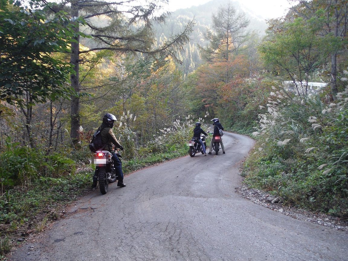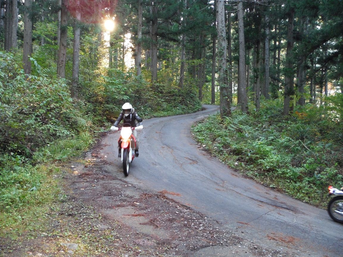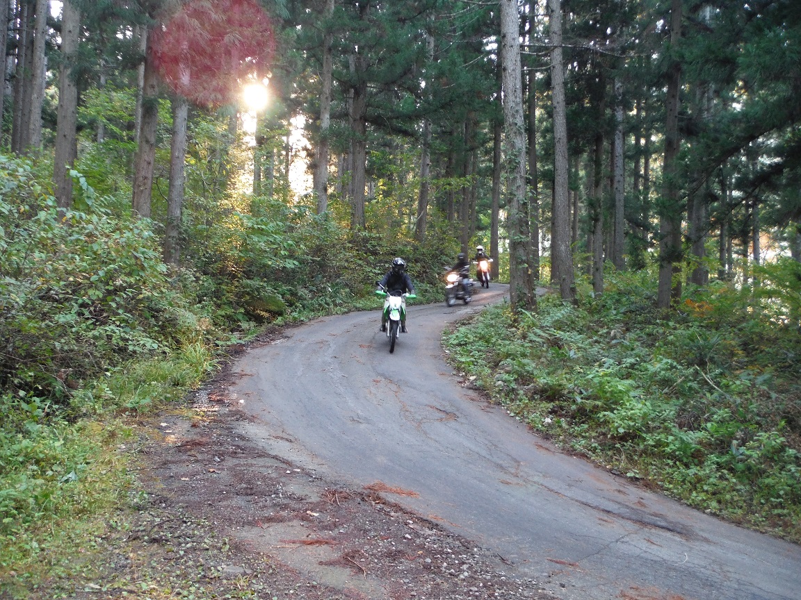 路面状態が良くなったところで先行、林道の入口に突入して撮影。