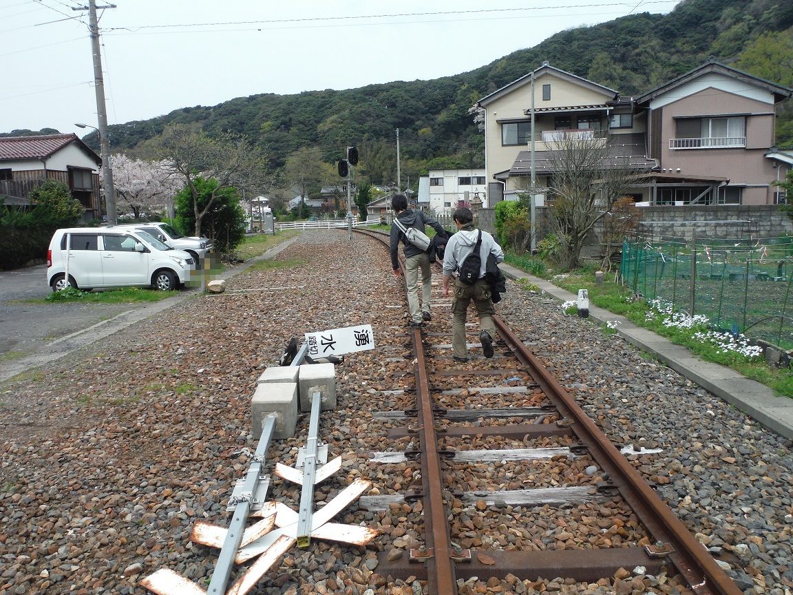 廃線のレールを辿って駐車場を目指す(BGM:スタンドバイミー