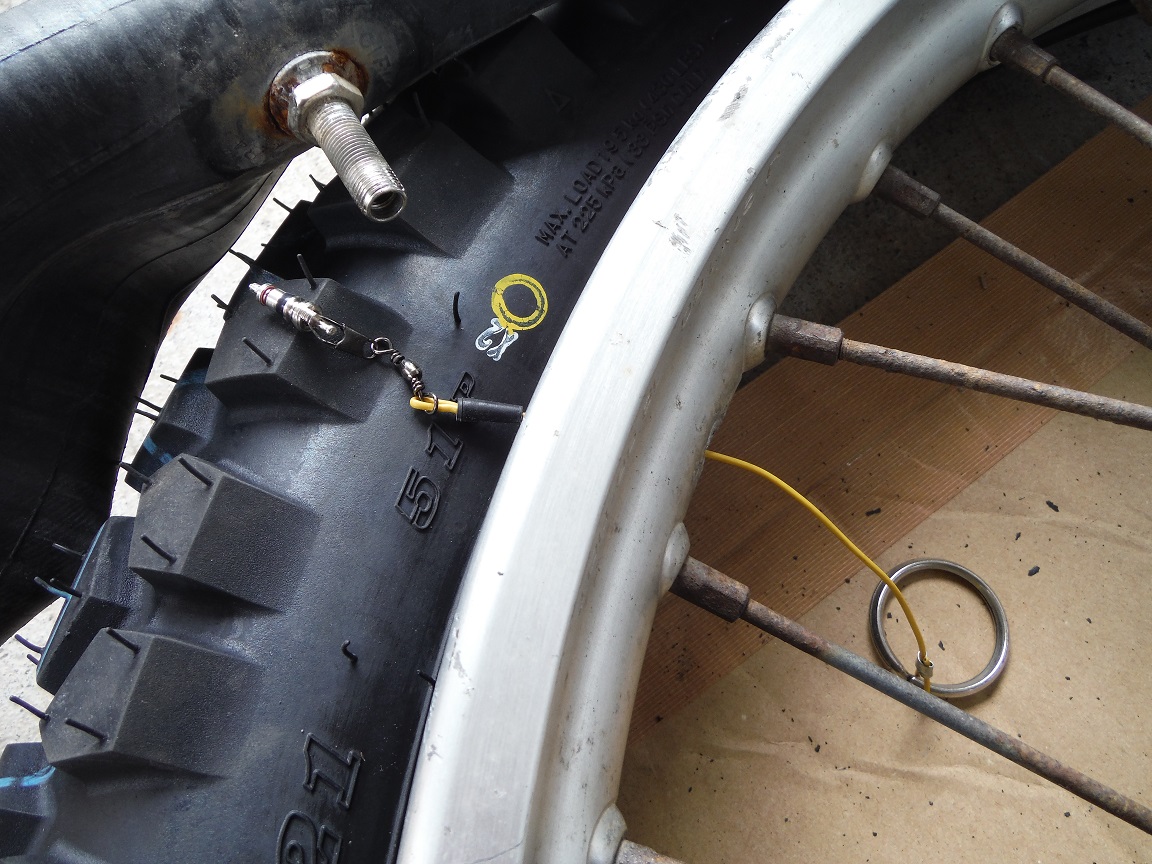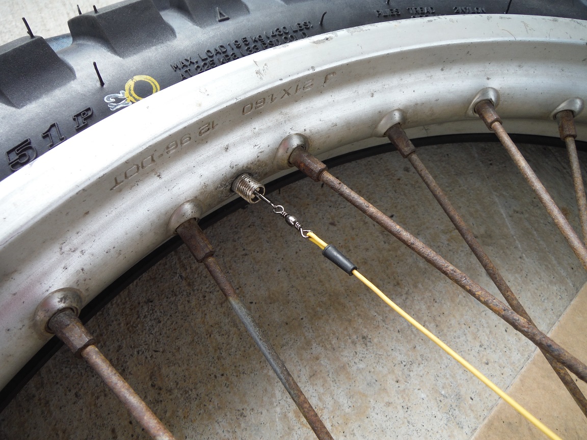 タイヤとリムの間にチューブを押し込み、先日自作した「バルブプーラー」の性能とやらを試してみる!