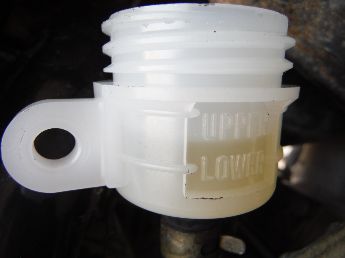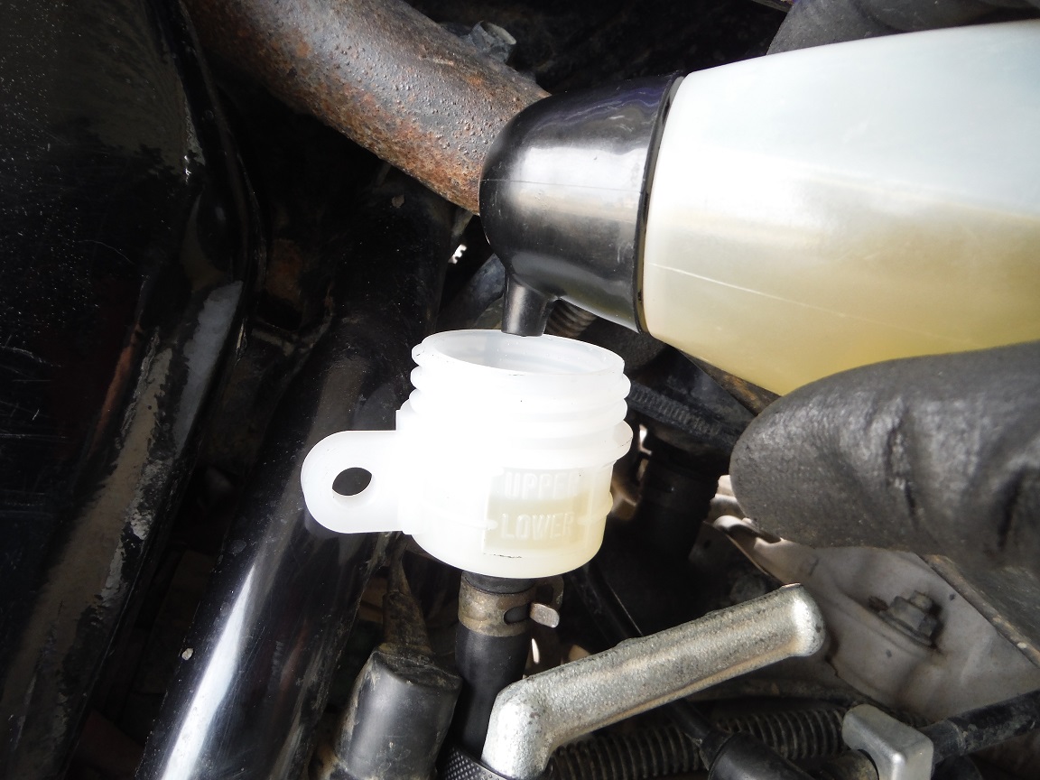 リザーバタンクのUPPERとLOWERの中間くらいまでブレーキフルードを満たしてから、キャップを締める(ブレーキパッドの減り具合と相談)