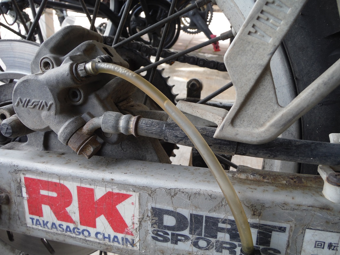 ブレーキフルードが新しい色に変わり、エア(気泡)の無いことが確認出来たらキャリパーのニップルをしっかり締める(キツく締めすぎるとニップルがポッキリ折れるので注意)