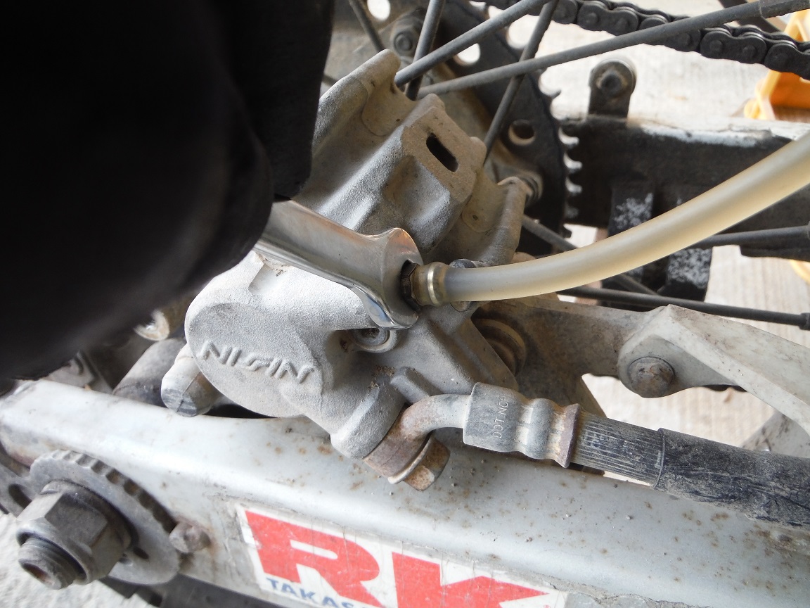 ちゃちゃっと組み付けて、ブレーキフルードが入れやすい位置に仮止めし(キックアームにインシュロックで固定)、ブレーキフルード注入とエア抜き作業の準備に掛る。