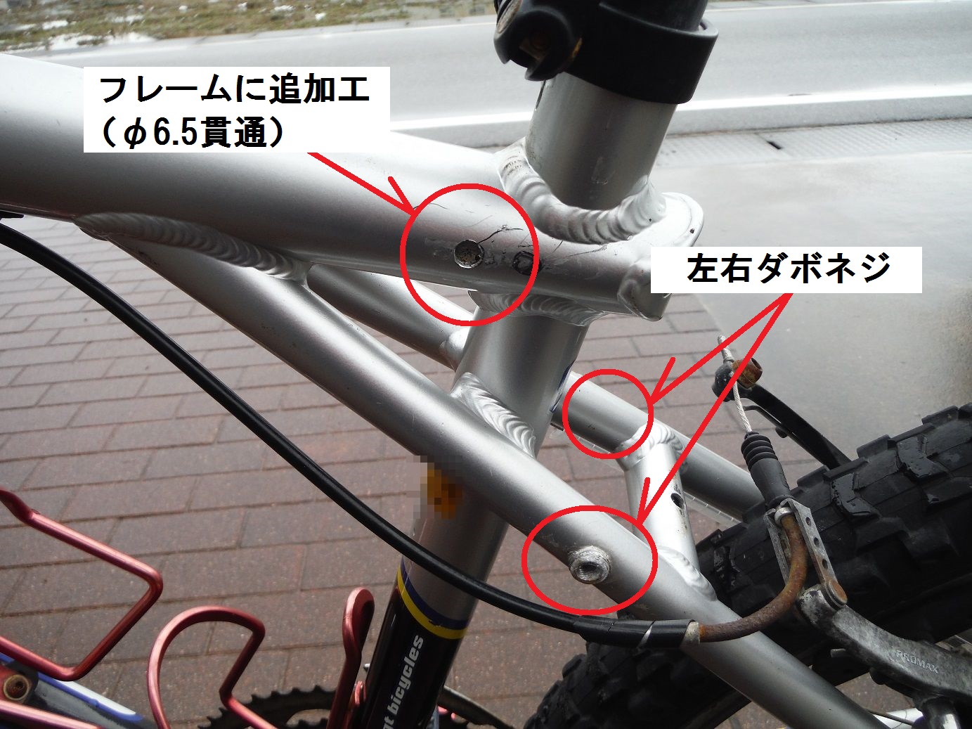 サドルポスト付近のフレームをドリルで貫通し、リアブレーキ付近にあるダボネジを利用することに決定。