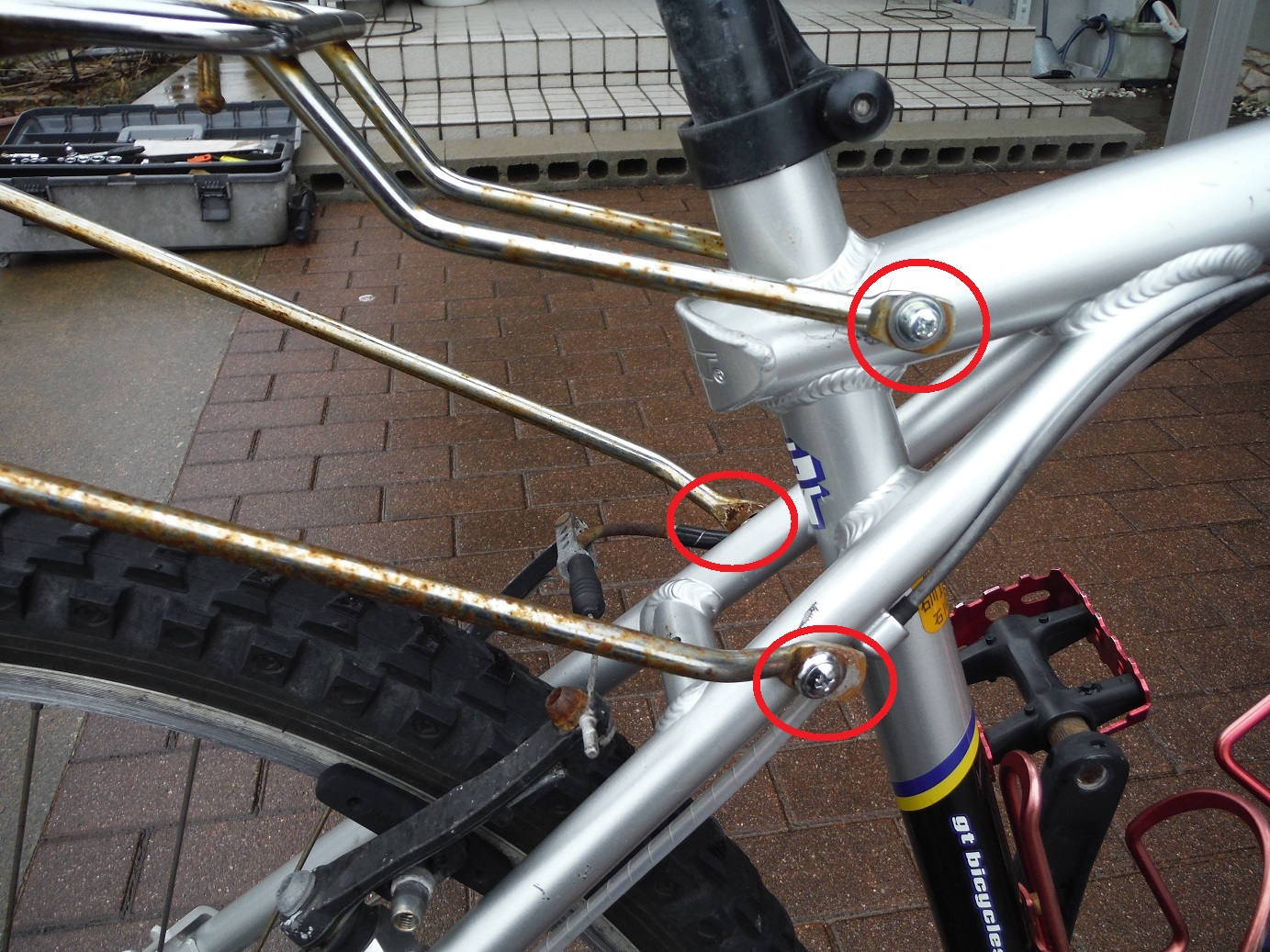 とりあえずMTBのフレームとママチャリの荷台を眺め、取り付け方法を検討。