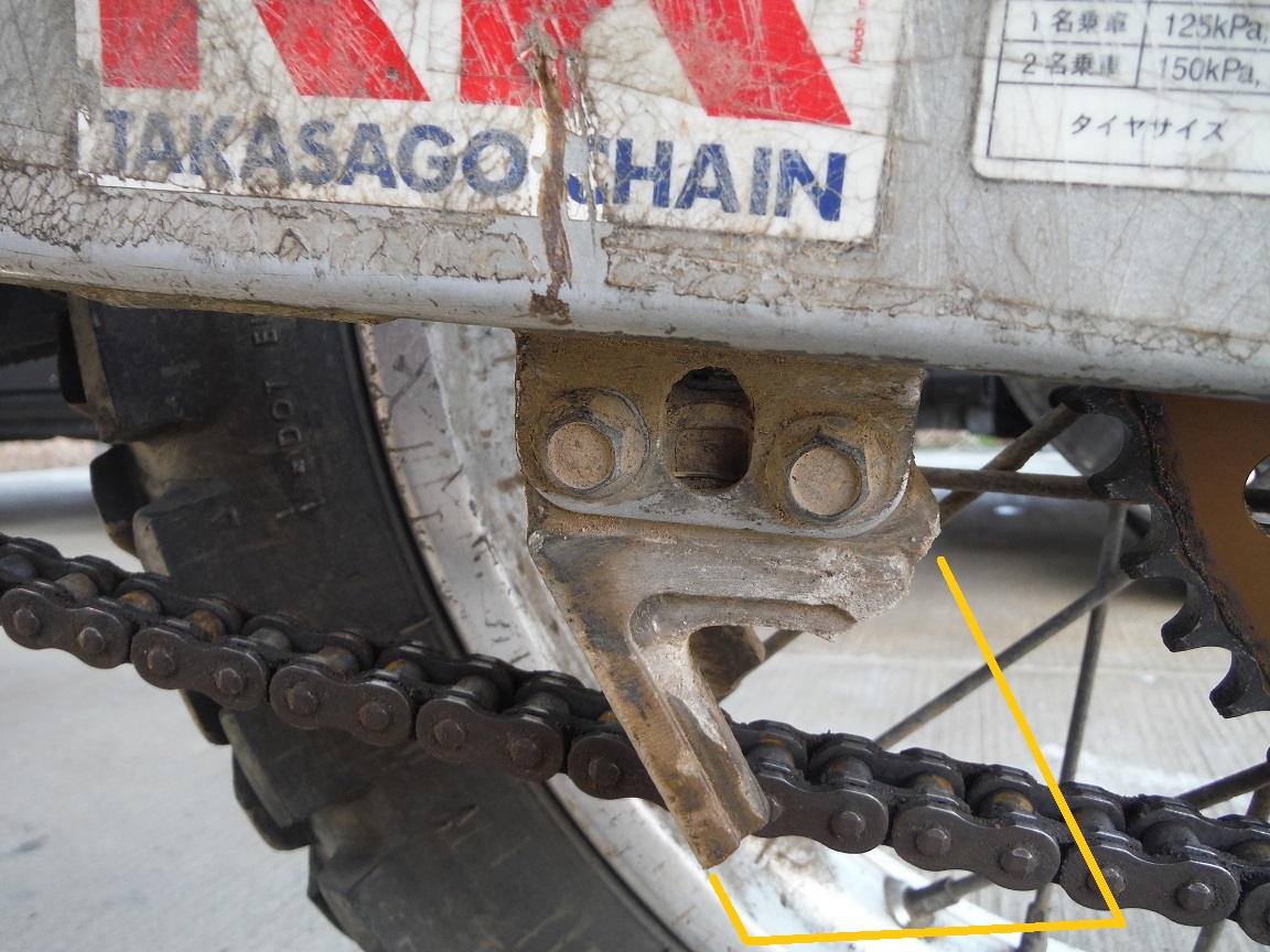 LANZAのチェーンスライダーは本来、スイングアームの上面、側面、下面をカバーしているのだが、御覧の有様(((><)))